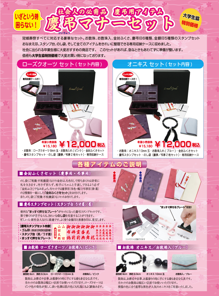 本サイトは本校を卒業し新社会人となる皆様に慶弔マナーセットをご注文いただくページです。